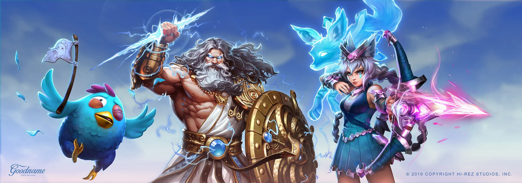 Key art we did for Hi-rez Expo. Here are three characters from their games: chicken from Realm Royale, Zeus from Smite and Io from Paladins.